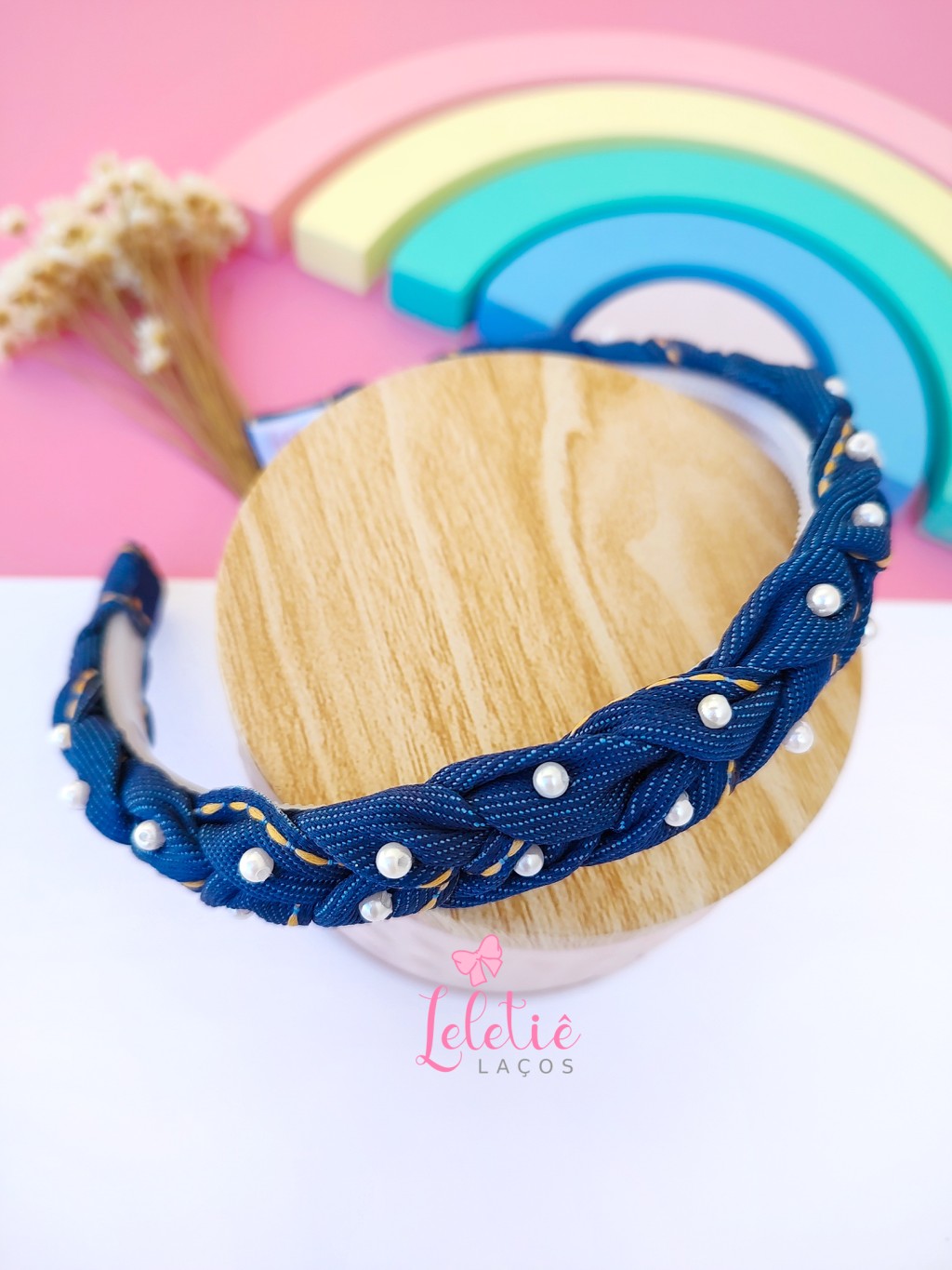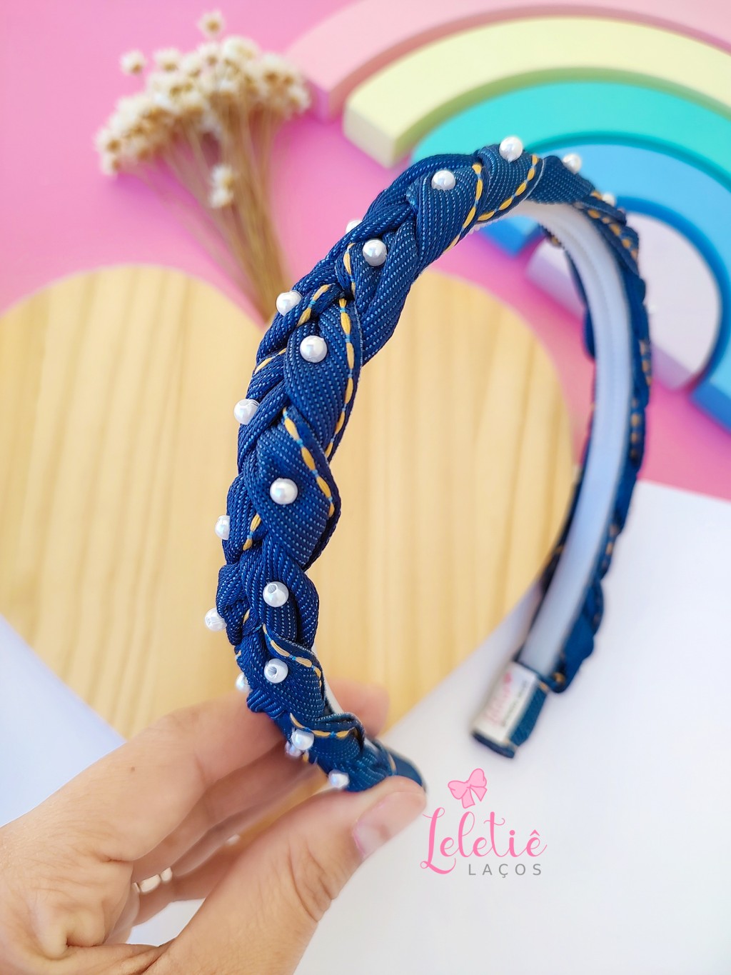 Tiara Jeans trançada bordada a pérolas.