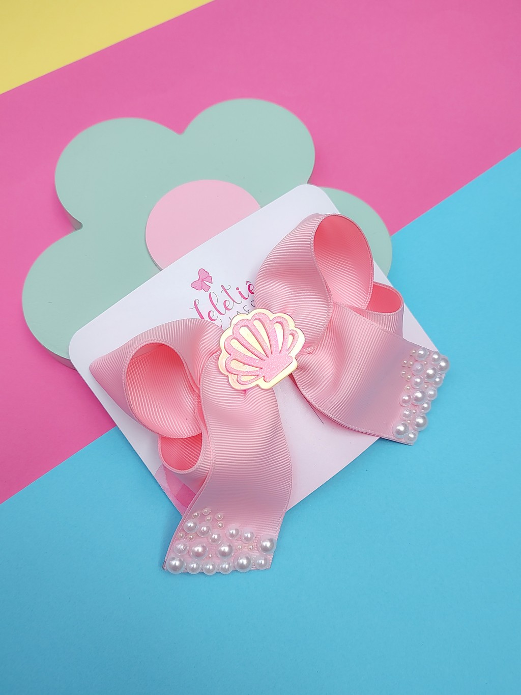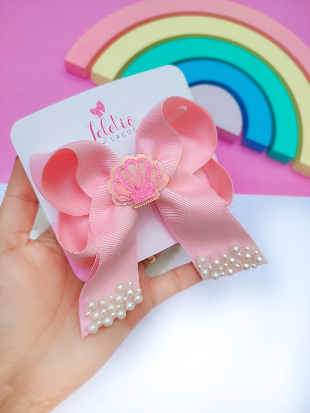 Laço tamanho G, com pontas bordadas com pérolas e aplique de concha.