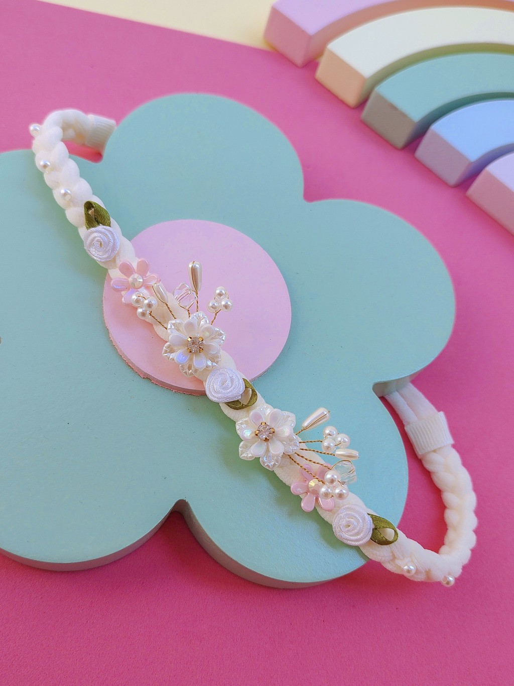 Faixinha off na meia de seda trançada e bordada com flores e pérolas aramadas