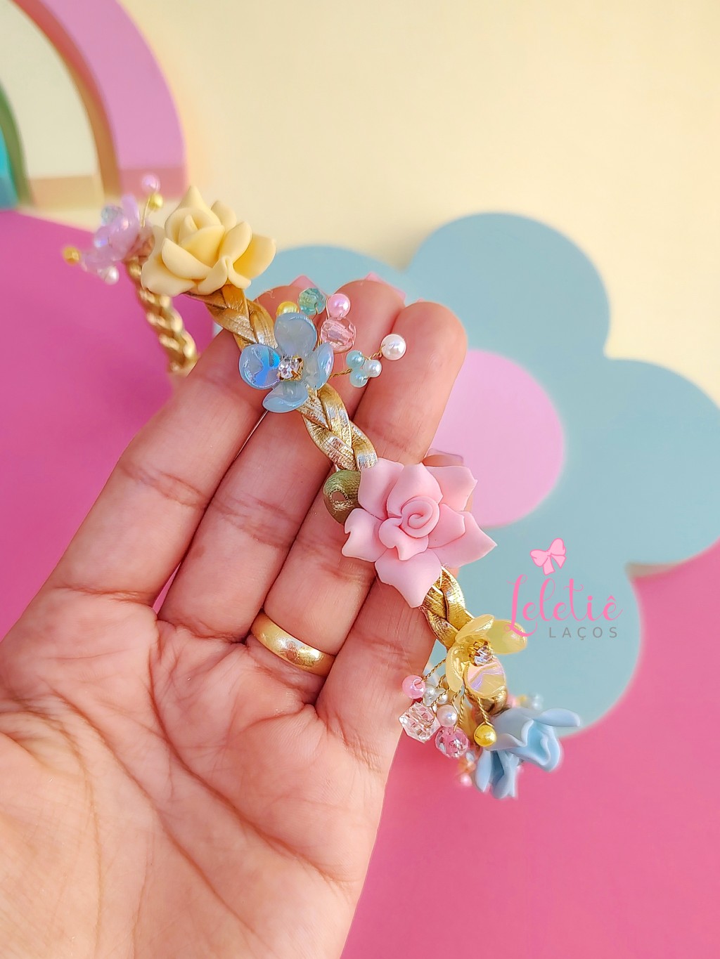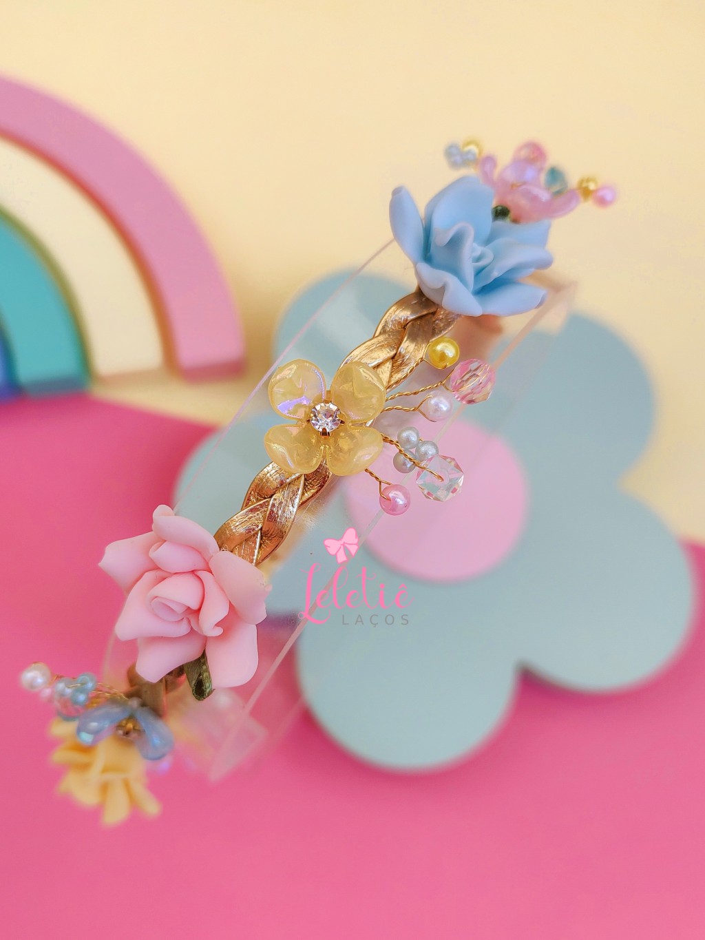 Headband na trança dourada com flores de porcelana e pérolas aramados.