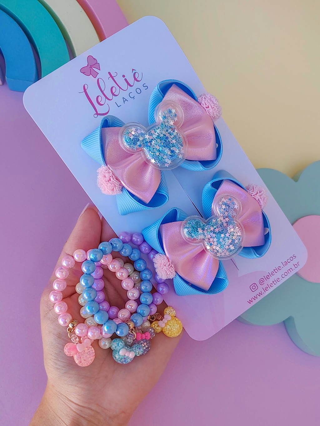 Par de Laços com lonita e aplique de movimento azul do Mickey. Pulseiras vendidas Separadamente.