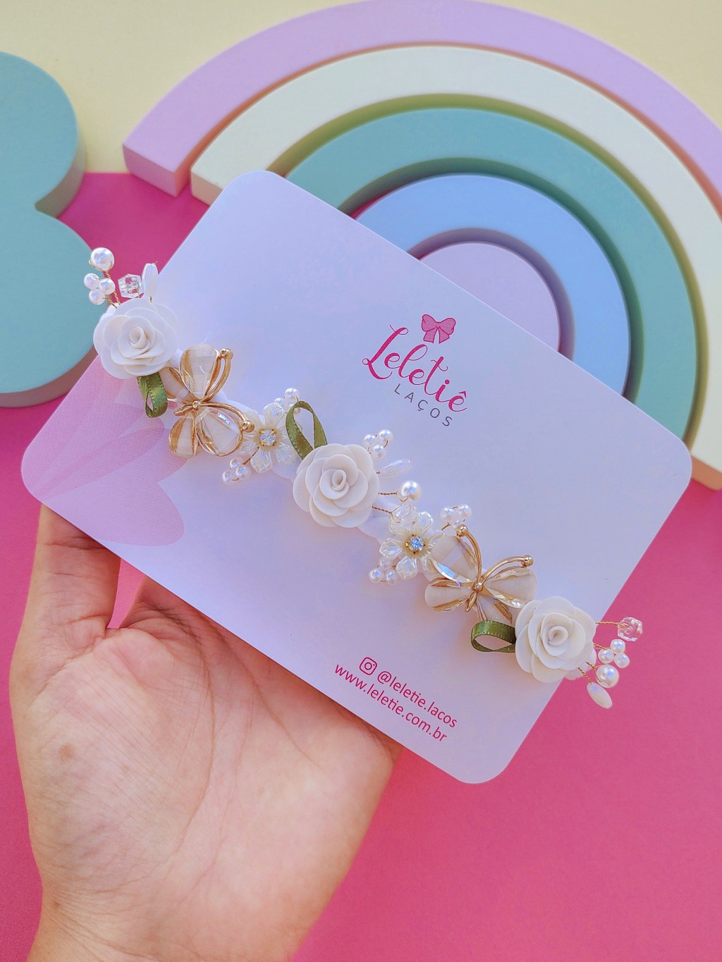 Tiara Headband na meia de seda trançada, com flores de porcelana fria branca, aramados e borboletas.