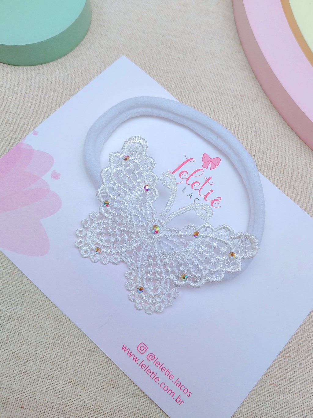 Faixa branca com borboleta rendada e strass.